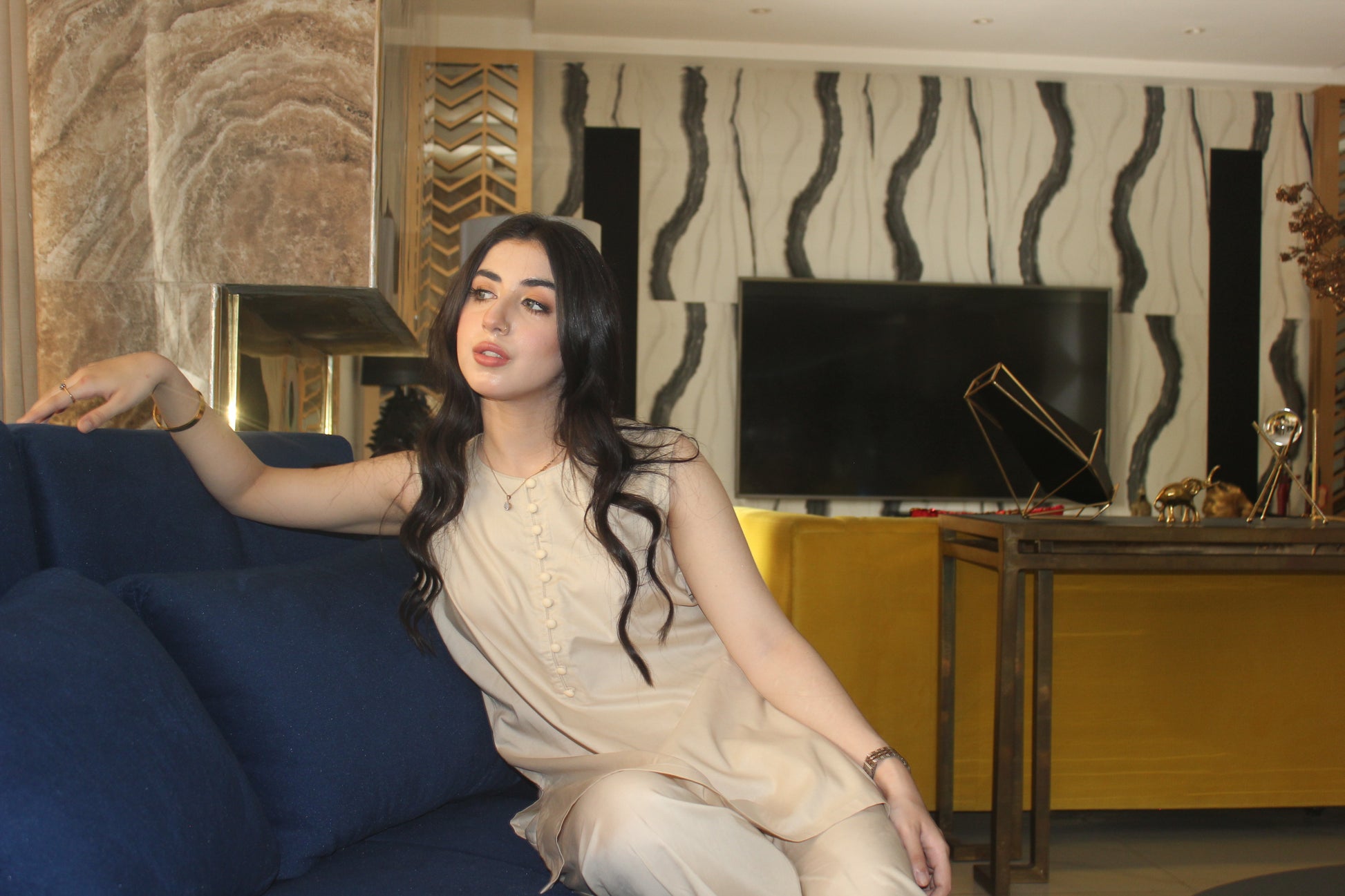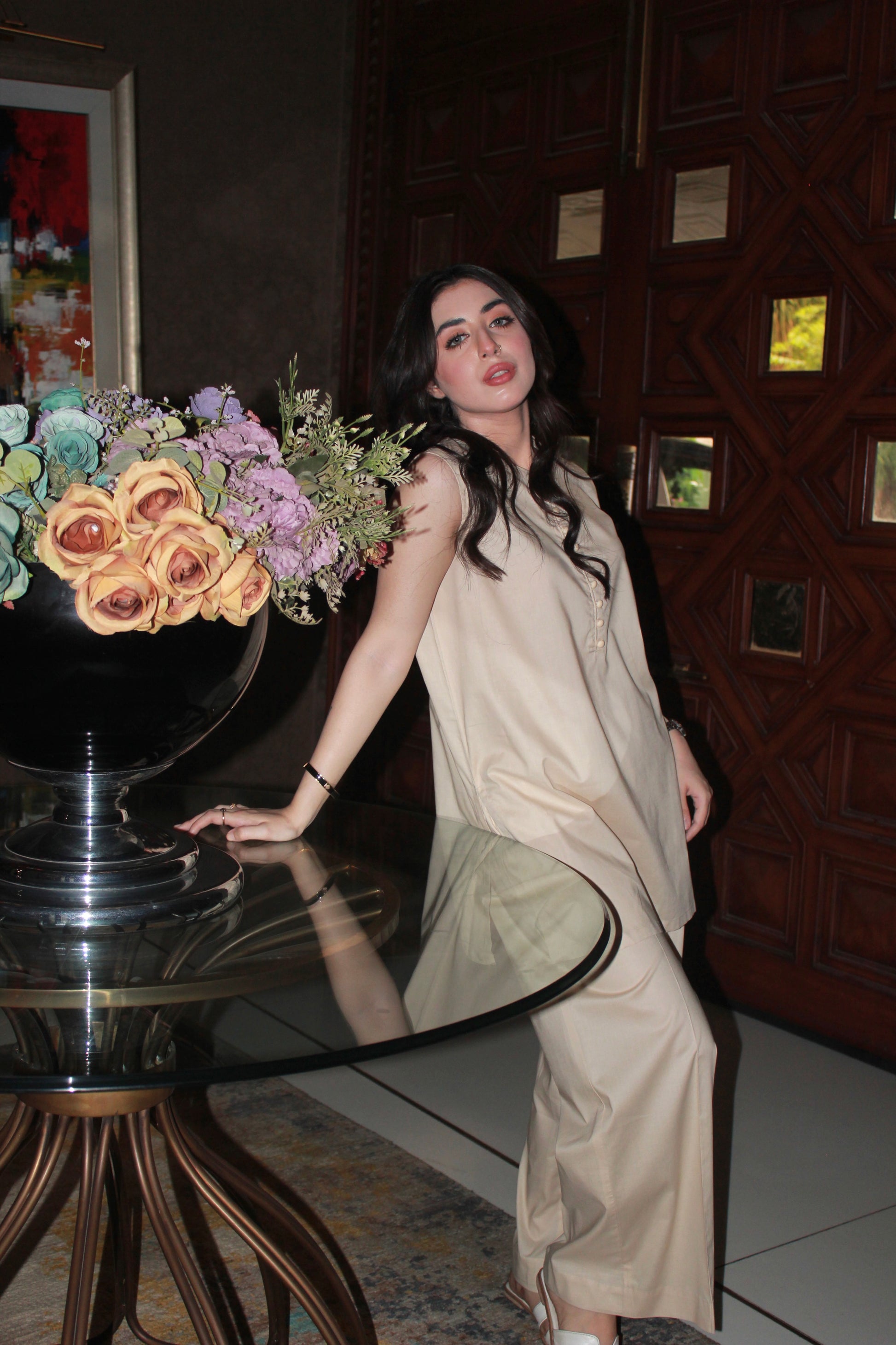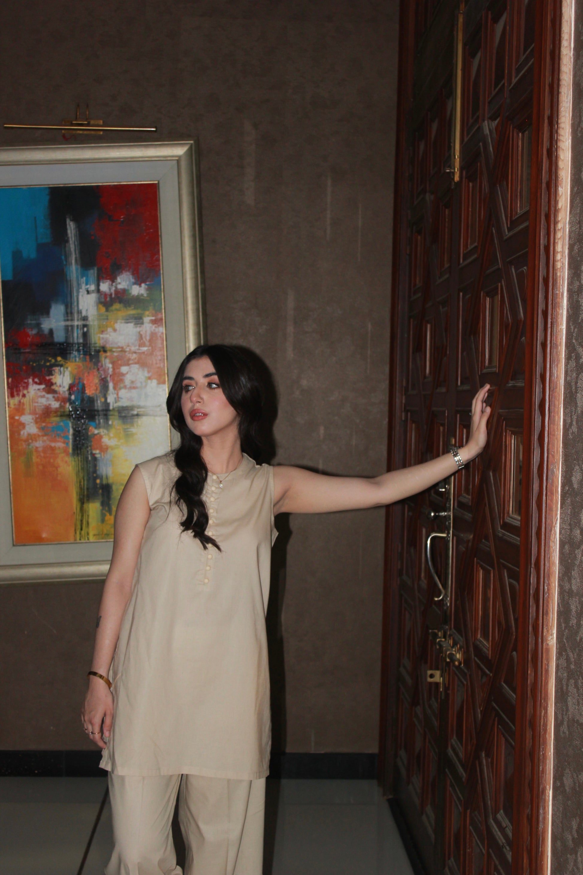 A classic beige 2-piece outfit designed with simplicity and comfort in mind. The sleeveless short-